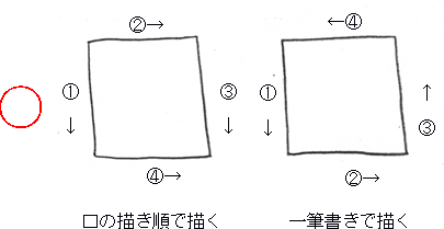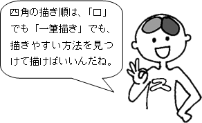 正方形は、一筆描きで描く方法と、漢字の「口」の描き順で描く方法がありますが、やり易い描き順で描いて下さい。