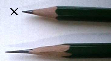 通常、文字を書く時には、このように削ると思いますが、デッサンをする場合は下の写真のようにカッターナイフや小刀を使って、鉛筆を削ります。