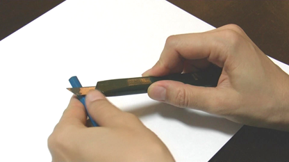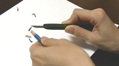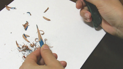 芯の部分は斜めにカッターの刃をあてて、先端に向けてすべらせ、少しずつ芯を鋭角に削ります。