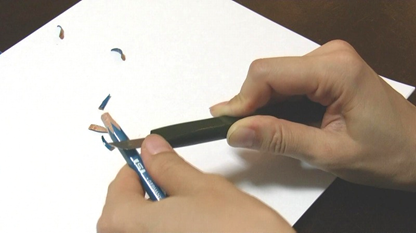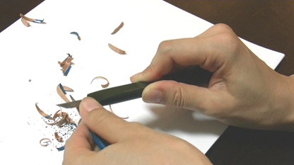 左手で鉛筆を転がすように回転させ、芯が均等に削れるようにします。