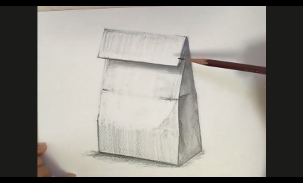 という事で、本日は「紙袋」のモチーフを皆んなで描きました。卒業生の参加もあり「描くの久しぶりです〜」なんて会話をしながらも、皆さん良い感じで描き進めていただきました。