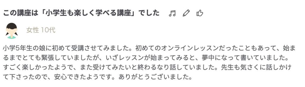 当スクールの講座は基本的に大人向けの内容ですが、保護者の方がそばで見守っていただける場合に限り、小学生のお子さまもご参加いただけます。実際に現在も、小学5年生のお子さまが毎回ご参加くださり、楽しみながら学んでいらっしゃいます。中学生のお子様は、お一人での参加も可能です。